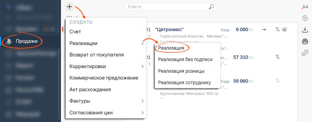 - В разделе «Документы/Исходящие» или «Продажи» нажмите «+» и выберите «Реализация».