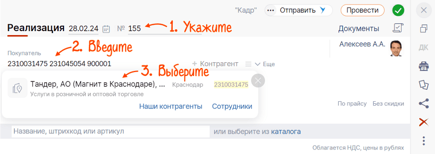 - Введите дату и номер реализации из своей учетной системы.