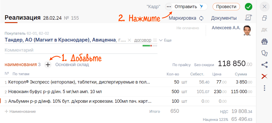 Перед отгрузкой товара торговой сети «Магнит Аптека» оформите реализацию.