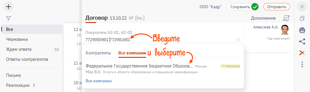- В поле «Получатель» введите ИНН/КПП РАНХиГС:7729050901/772901001. На вкладке «Все компании» выберите организацию из списка. Введите сумму договора и срок действия, если они известны.