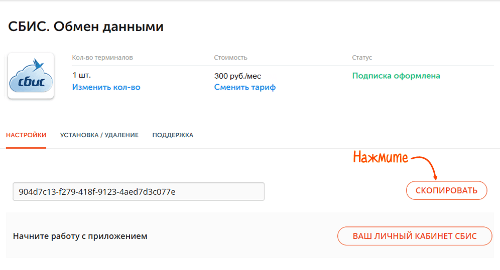 Saby может обмениваться данными со смарт-терминалами Эвотор. Для этого требуется ключ доступа к облаку компании. Скопируйте его на сайте производителя.