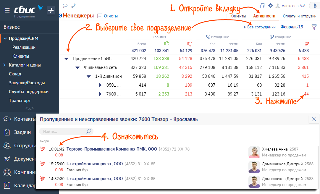 В СБИС CRM есть возможность отслеживать и исправлять пропущенные звонки, по которым не перезвонили клиенту.