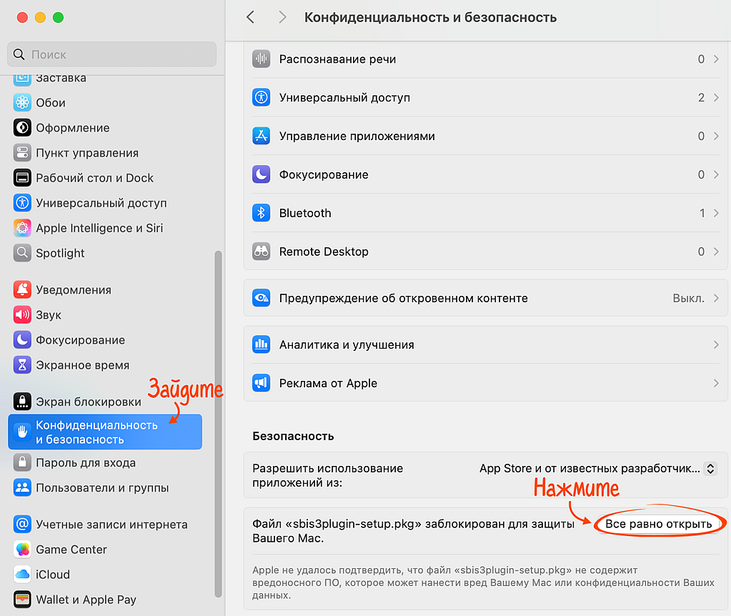 для macOS 15 и выше: запустите установочный файл, затем в системных настройках зайдите в «Конфиденциальность и безопасность» и кликните «Все равно открыть».