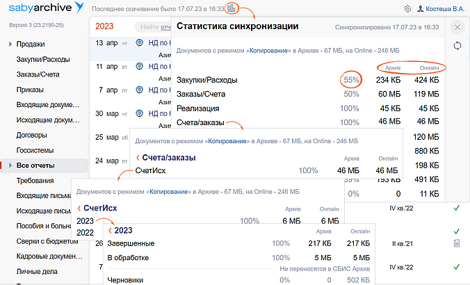 СБИС Архив — удобное офлайн-приложение, которое позволяет работать с актуальными версиями документов даже при отсутствии интернета. Отчеты и документы переносятся в Архив через резервное копирование. Теперь вы можете наглядно контролировать процесс копирования данных с online.saby.ru в СБИС Архив. Просто зайдите в приложение и кликните на ссылку последней синхронизации в верхней части экрана.