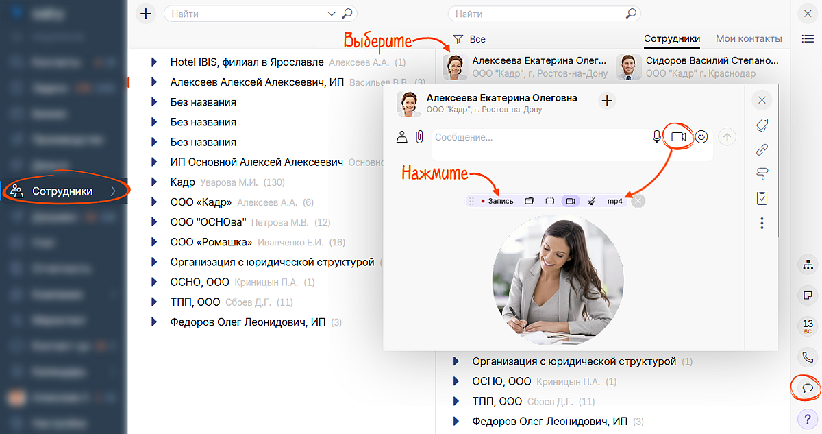 Отправлять коллегам видеосообщения из карточки сотрудника за пару кликов.