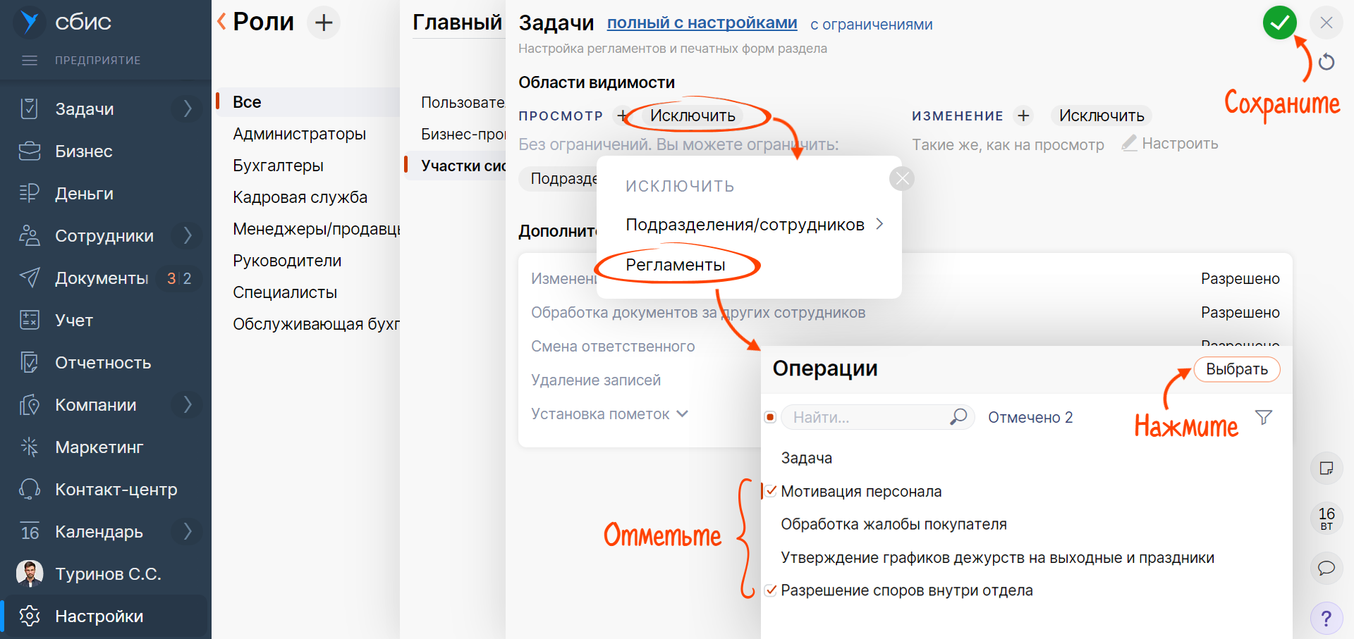 Работники могут случайно перепутать операции или есть тип задач, который не нужно всем видеть? Ограничьте доступ к конкретному регламенту. Например, к согласованию премий.