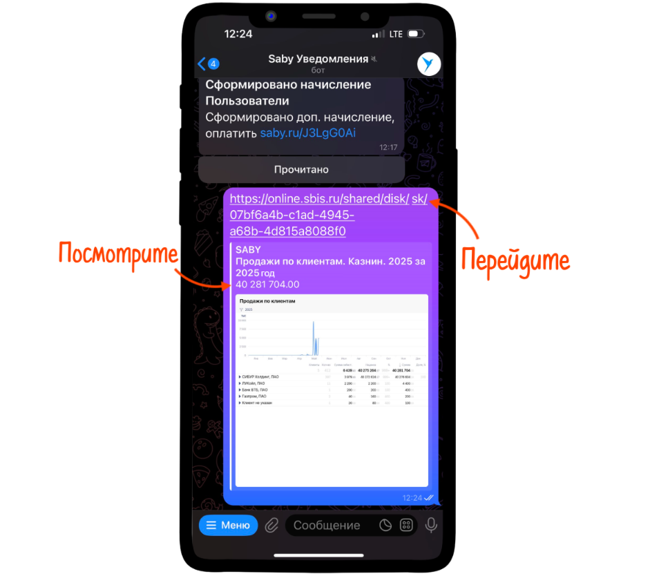 Готово: система автоматически сформирует отчет и пришлет уведомление — в Saby, Telegram, push в мобильном приложении или на email. Вы увидите ключевые показатели и сможете перейти по ссылке к полному отчету.