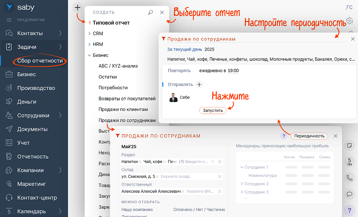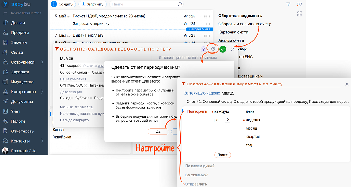 Теперь в Saby можно настроить автоматическое формирование аналитических отчетов по расписанию. Больше не нужно каждый раз вручную выбирать параметры — просто один раз задайте их и укажите периодичность. Система будет регулярно строить отчеты для вас.