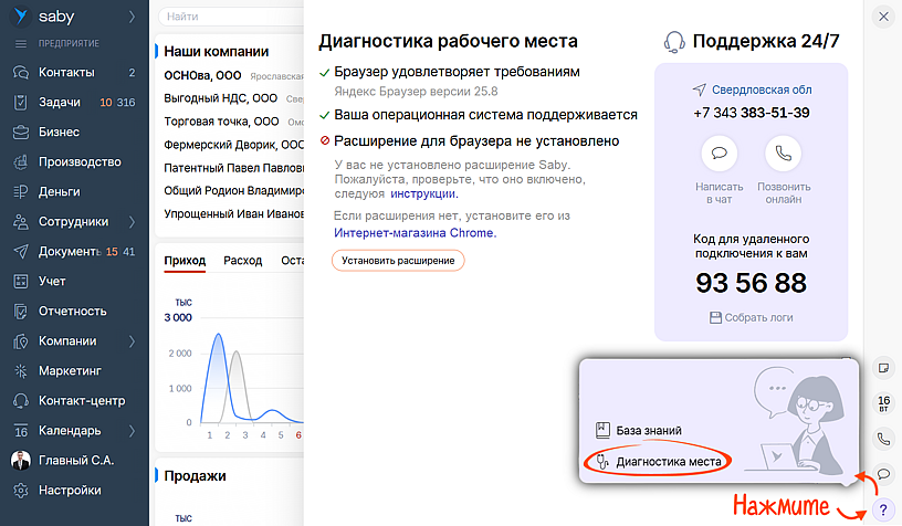 На любой странице Saby нажмите и выберите «Диагностика места» — запустится проверка. Если система найдет отклонения, она устранит их. Например, обновит версию «КриптоПро».