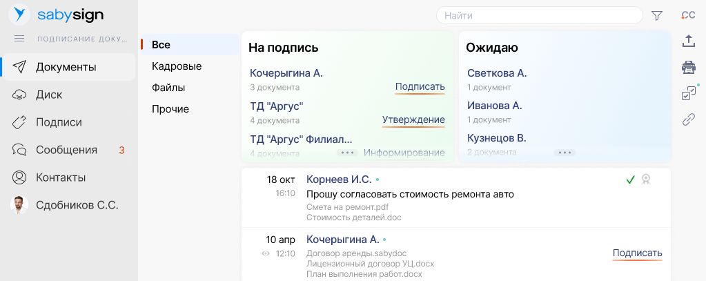 Saby Sign поможет легко подписать кадровые и любые другие документы — например, авансовый отчет, заявление на отпуск, приказ о командировке. Все — без переключения между сервисами. Документы не нужно распечатывать и хранить в бумажном виде.