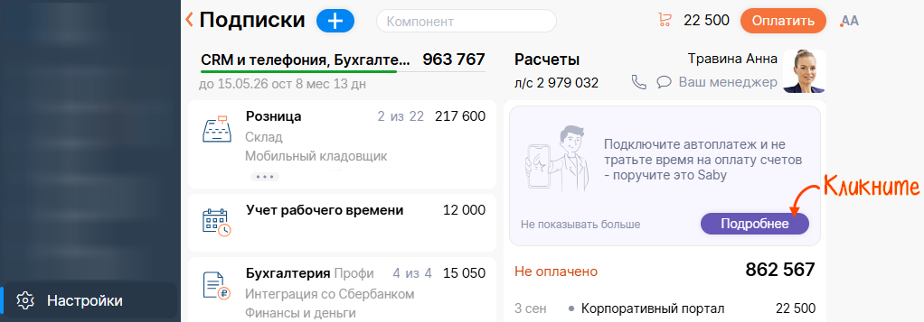 Подключите автоплатеж, и Saby сам проследит, чтобы ваши лицензии всегда оставались актуальными.