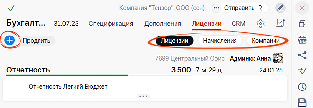 Удобное управление лицензиями. Подключайте их в карточке договора по подсвеченной кнопке «+».