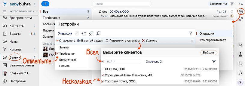 В разделе «Заявки» перейдите в настройки, отметьте «Требования» и кликните «Подключить клиентам». Выберите сразу всех клиентов или только нужных.