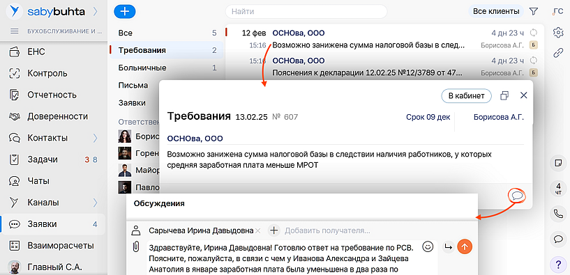 Уточняйте детали прямо из карточки заявки. Клиент получит сообщение в мобильном приложении Saby и оперативно вам ответит.