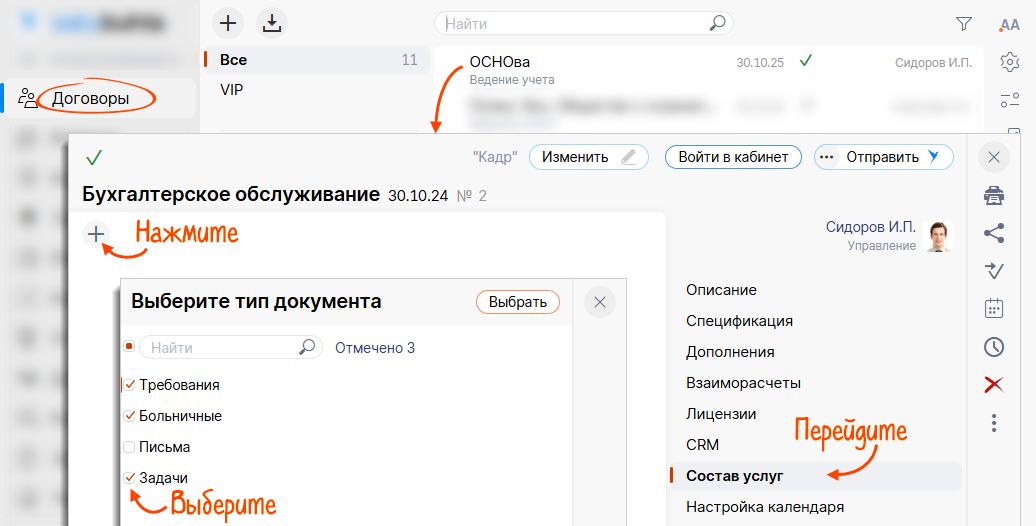 В карточке договора выберите документы клиента, которые будете обрабатывать за него. Заявки по требованиям, больничным и письмам от госорганов будут поступать автоматически. Остальные клиент сможет сам направлять вам на обработку.