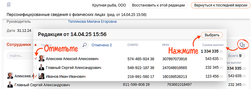 Просто нажмите на плюс при заполнении сотрудников, выберите нужную редакцию и людей: одного, нескольких или всех сразу. Система перенесет сотрудников, их реквизиты и суммы из выбранной корректировки.