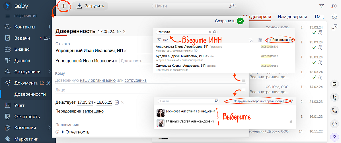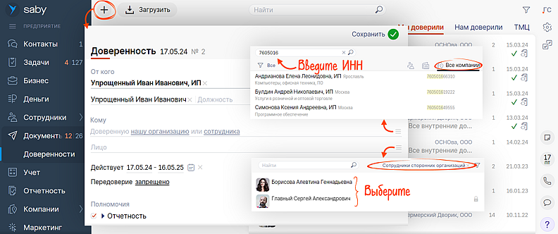 В разделе «Документы/Доверенности» кликните на «+» и заполните доверенность. Укажите: