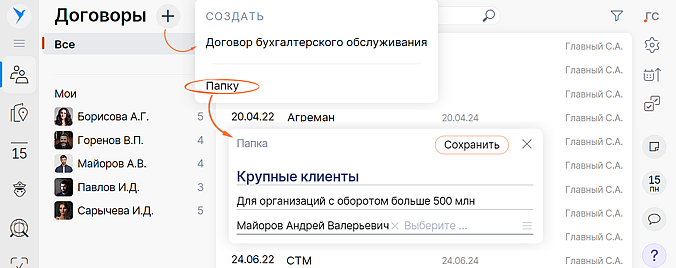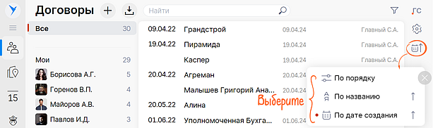 Отсортировать договоры по алфавиту, дате или заданному порядку. Чтобы документы располагались в списке так, как вы хотите (независимо от даты создания или названия контрагента):