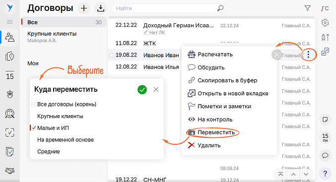 Чтобы перенести договор, нажмите на три точки напротив него, кликните «Переместить» и выберите папку.