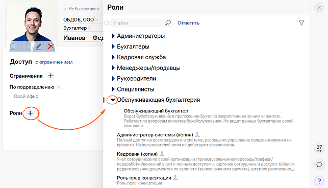 Просто дайте сотруднику доступ в кабинет клиента из карточки договора — и ему будет автоматически назначена роль «Обслуживающий бухгалтер». Также вы можете вручную назначить роль любому сотруднику.