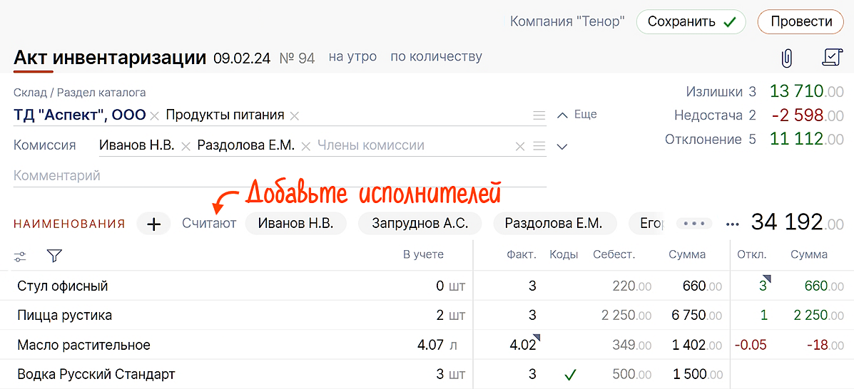 Проводить инвентаризацию теперь можно быстрее — с заполнением разными сотрудниками. Просто добавьте исполнителей в документ и создайте для них описи. Заполнять их можно одновременно и с компьютера, и в мобильном приложении. Каждый работник будет инвентаризировать свой отдел, а руководитель увидит итог по всем сразу и, если нужно, — по каждой описи в отдельности.