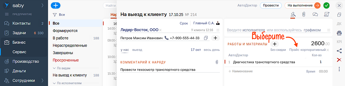 Администратор Лена из «АвтоДоктора» оформляет плановый техосмотр. В наряде она выбирает клиента, добавляет диагностику и выбирает прайс с корпоротивной скидкой — цены подтягиваются автоматически. По кнопке «Чек» Лена принимает оплату удобным способом: картой, наличными или по QR-коду. На все — 3 минуты.