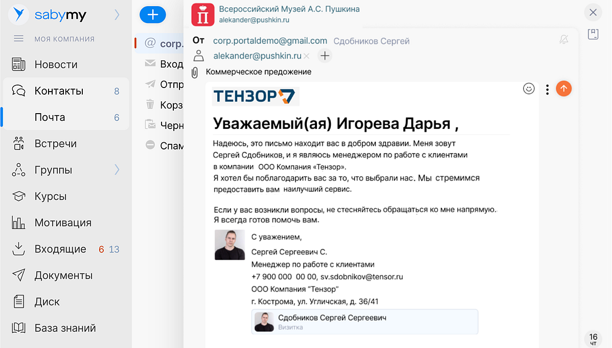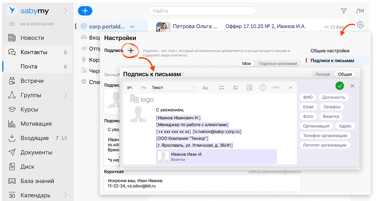 ставит правильную подпись — подбирает нужные контакты: автоподпись для конкретного письма, общего ящика или личную визитку менеджера.