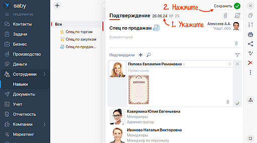 Если выдаете самостоятельно, создайте «Подтверждение» и добавьте в него тех, кто аттестован. Вам не придется указывать навык каждому по отдельности. Подтвердите навыки по клику на «Сохранить».