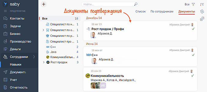 Система навыков в СБИС прозрачна для сотрудников и руководителей. При решении спорных вопросов во вкладке «Документы» вы легко найдете, кто и когда подтвердил навык, отказался или поместил в архив.