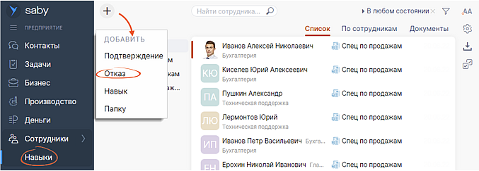 При отказе подтверждать навык в карточке сотрудника в разделе «Образование и навыки» создайте «Отказ». Для группы сотрудников сформируйте документ через раздел «Навыки».