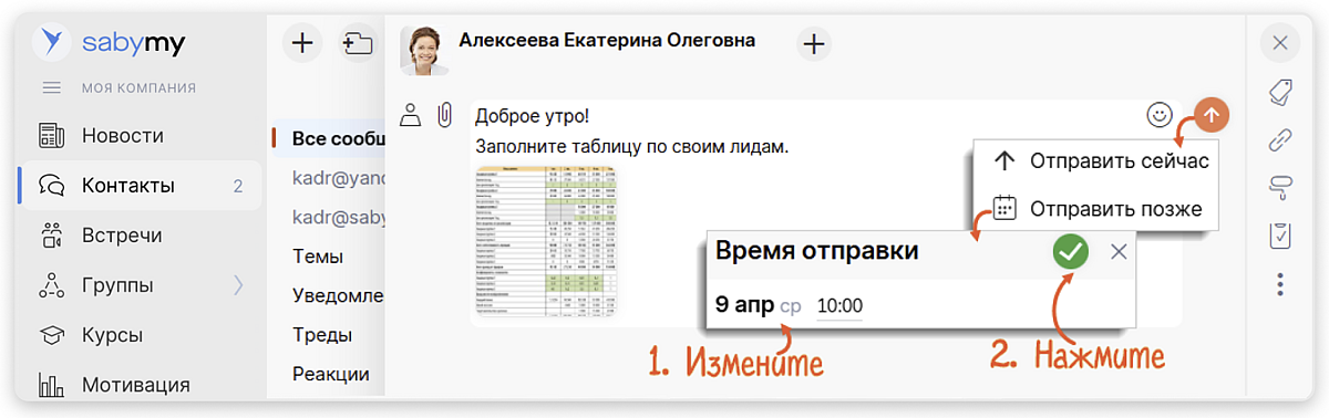 Отложенные сообщения — для отправки в нужный день и час. Чтобы не тревожить коллег в выходные или нерабочие часы, запланируйте, когда доставить написанное. Просто кликните правой кнопкой мыши и выберите «Отправить позже». Измените время, нажмите .
