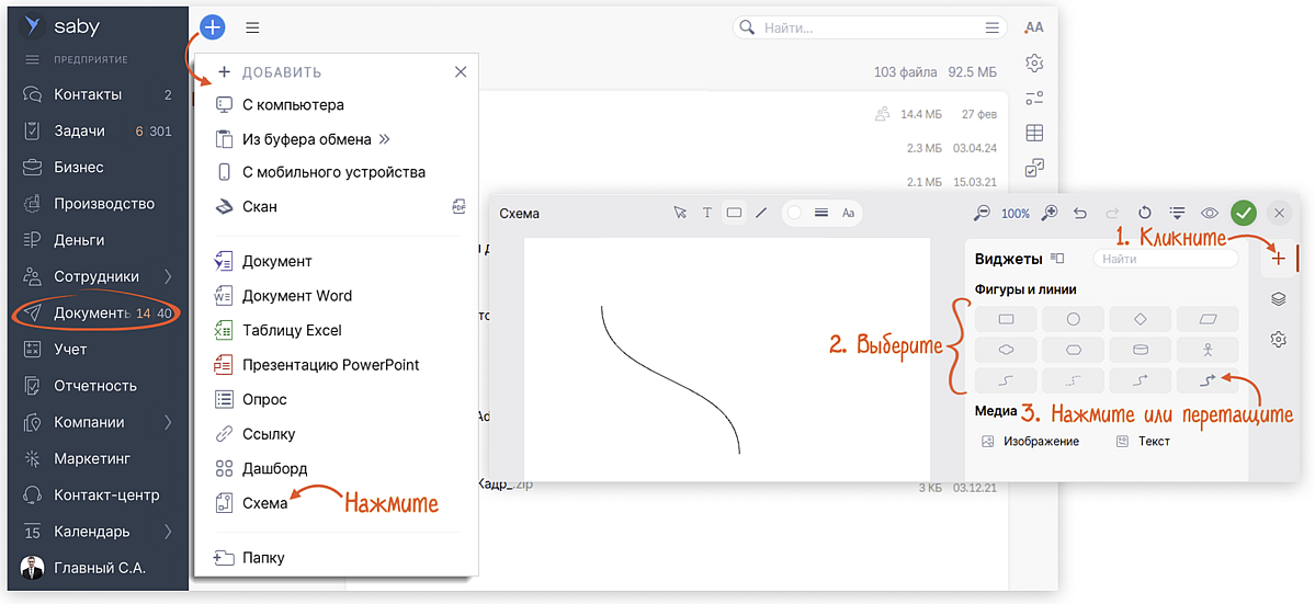 Создавайте схемы прямо в Saby. Если нужна оргструктура, блок-схема или mindmap — теперь не нужно искать отдельный сервис. Все есть в документе «Схема». Выбирайте готовые виджеты: фигуры, стрелки, текст. Элементы можно двигать, настраивать, соединять, добавлять подписи — в привычной логике документов Saby.