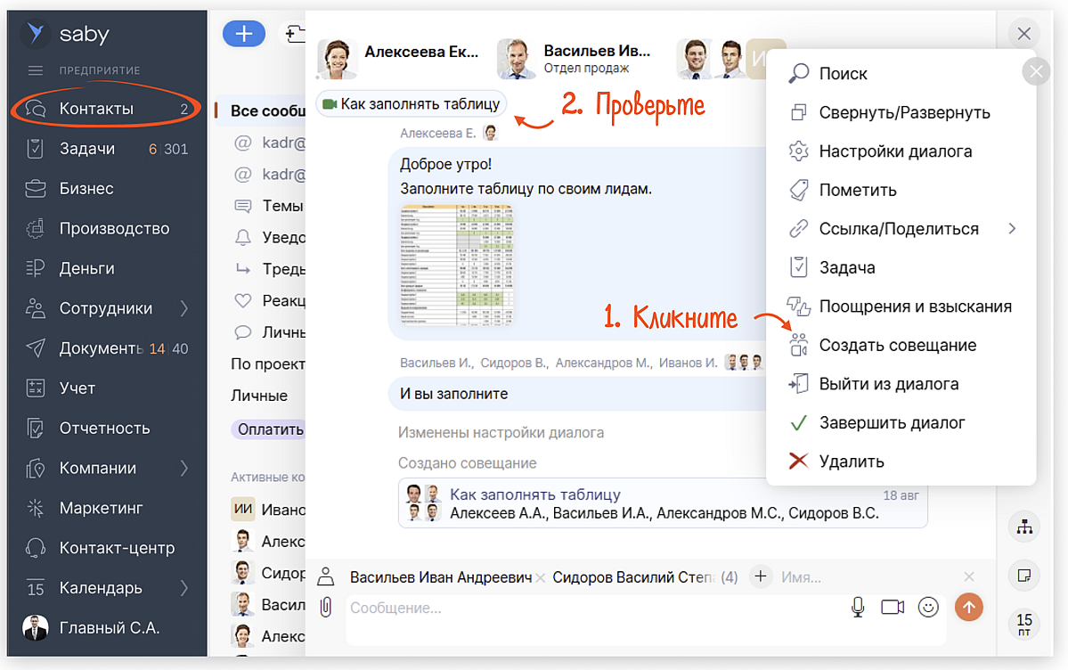 Совещания — сразу из чата. Обсуждение рабочего вопроса можно быстро вынести на встречу. Нажмите в переписке «Создать совещание» — участники добавятся автоматически, а ссылка закрепится в верхней части общего диалога.