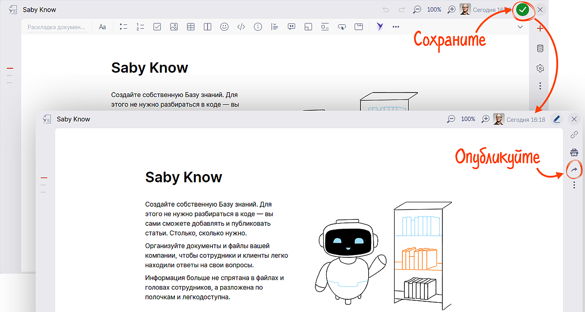 Новый интерфейс сохранения и публикации статей в базе знаний — для четкого контроля процессов. Мы изменили логику кнопок в редакторе, чтобы сделать управление версиями понятнее. Раньше вы сразу выбирали: опубликовать материал по клику на ✅ или просто сохранить. Теперь мы разделили процесс: