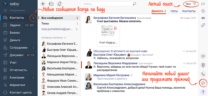 Пишите коллегам из любого раздела кабинета, не прерывая работу, — просто нажмите на облачко в нижнем углу экрана.