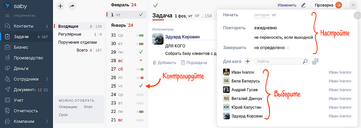Регулярно оформляете одинаковые наряды, отправляете одни и те же счета и ставите повторяющиеся задачи? Больше не придется тратить на это время. Настройте частоту их повтора, и в следующий раз Saby (СБИС) запустит все по составленному графику за вас. Наряды и задачи уйдут получателю, а счета в виде черновика буду ждать вашей подписи.