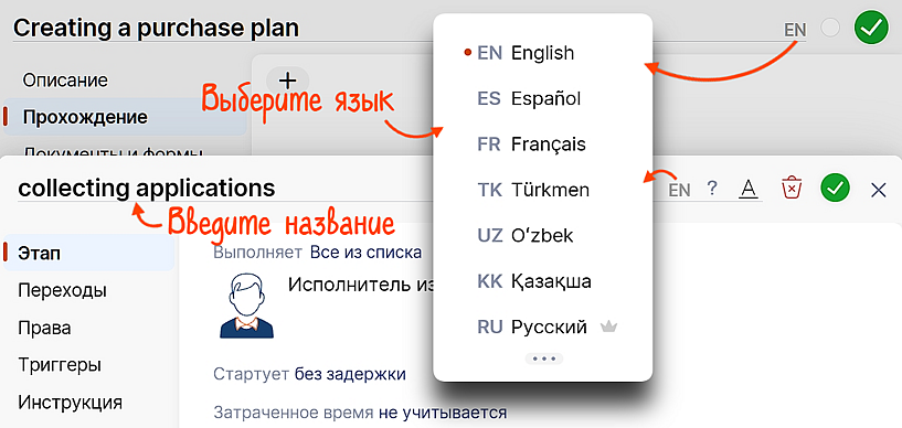 Упростили работу в Saby для иностранных сотрудников. Теперь даже в ваших собственных бизнес-процессах названия регламента, его этапов и переходов будут отображаться на том языке, который пользователь выбрал для работы в системе. Просто добавьте перевод на нужных языках при настройке операции.