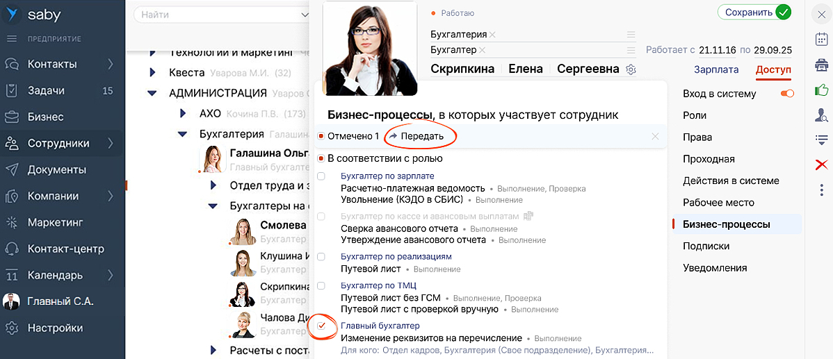 Раньше на передачу дел уходило много времени: вручную проверять все бизнес-процессы, удалять и добавлять сотрудников на каждом этапе, назначать роли. С Saby все станет проще и прозрачнее.