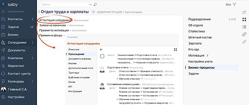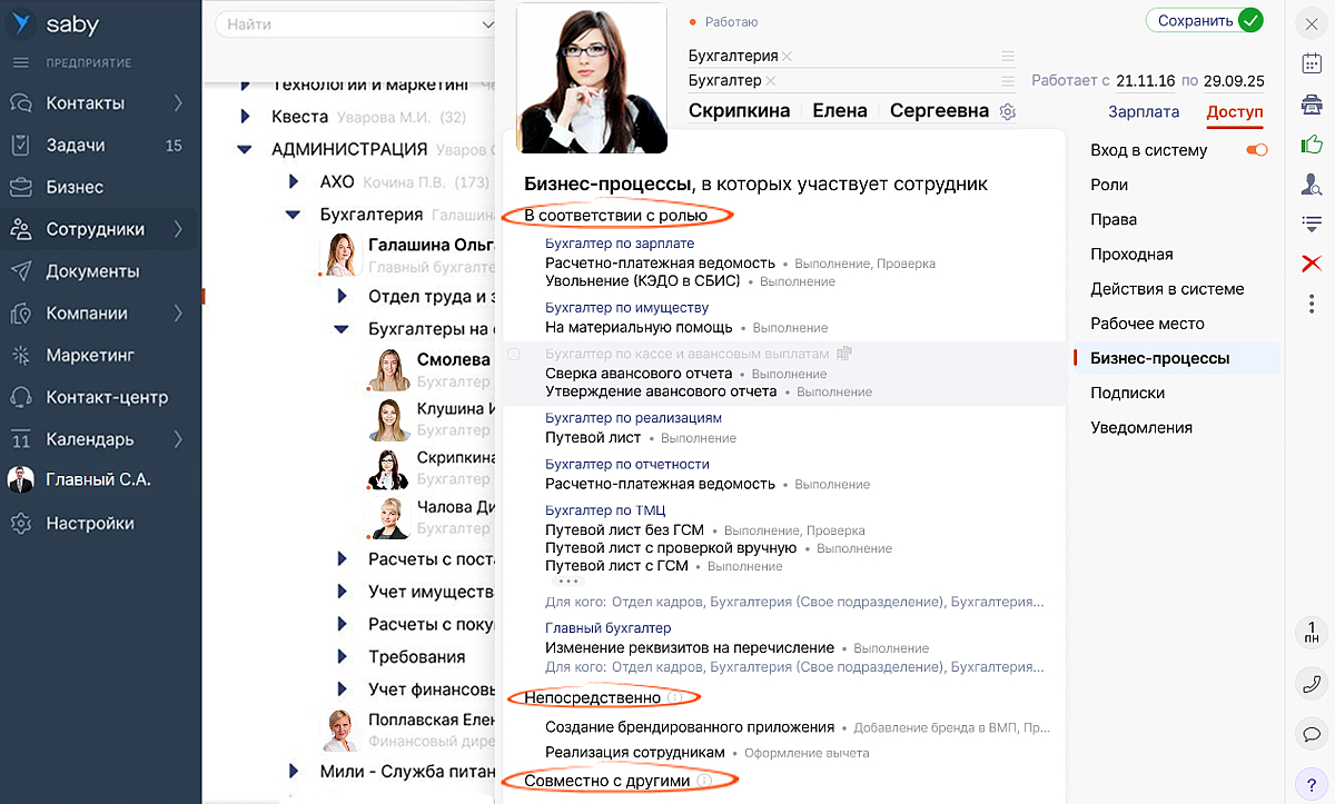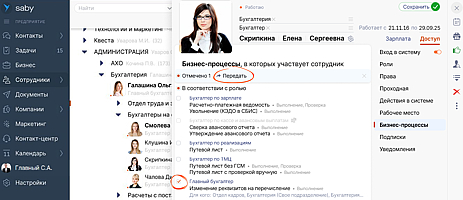 Посмотреть и настроить бизнес-процессы подразделения можно как из карточки работника, так и через раздел «Сотрудники».