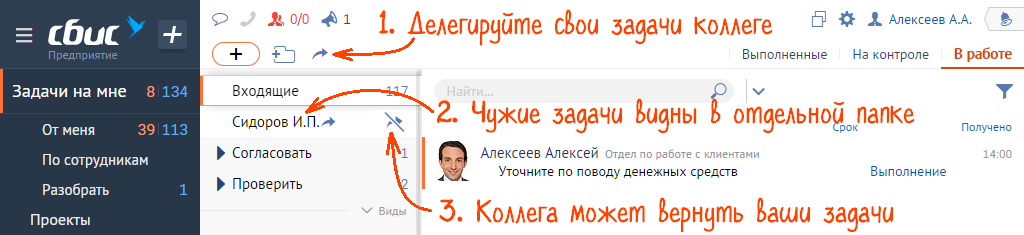 Прочитайте подробнее о делегировании задач коллегам на справочном портале СБИС.