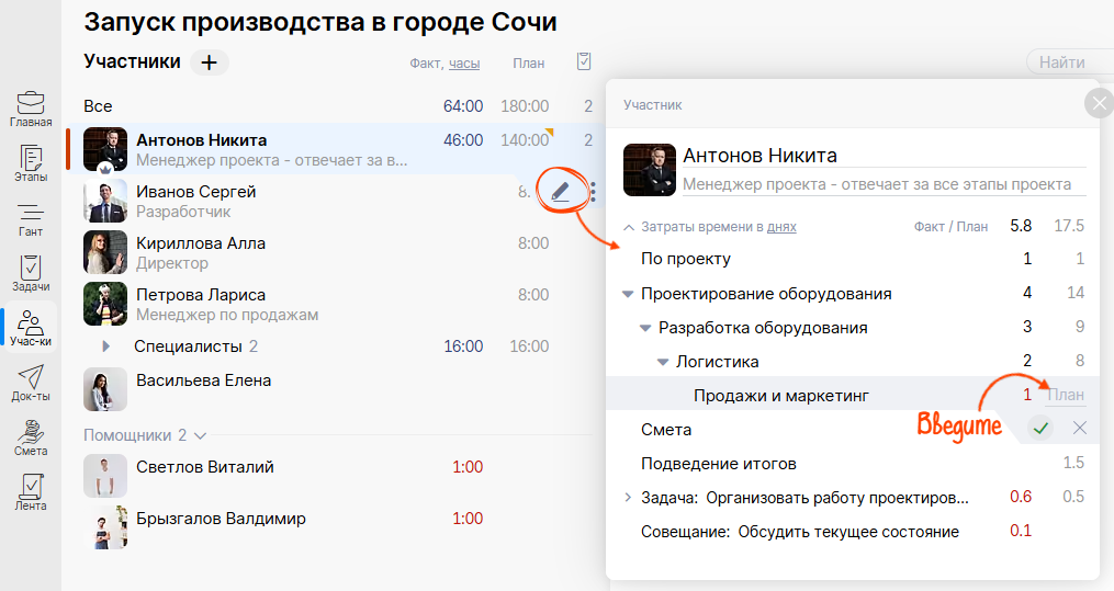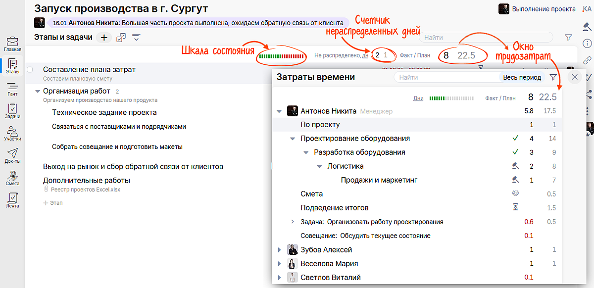 Теперь видно, сколько времени каждый сотрудник планирует потратить и сколько уже потратил на каждом этапе проекта. Можно быстро оценить, кто перегружен, а у кого есть свободное время, и перераспределить задачи.