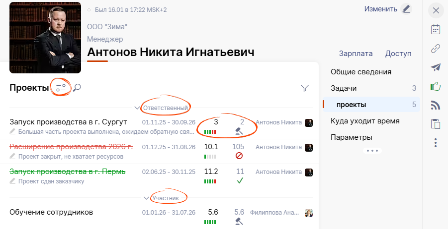Теперь проще понять роль и загрузку сотрудника. Прямо в его карточке видно, в каких проектах он участвует, за что отвечает и сколько времени тратит.