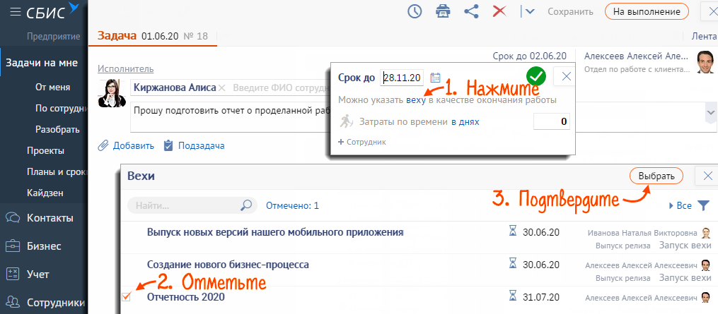 Завершение квартала или премьера новой версии сайта. У таких масштабных событий всегда есть строгий срок выполнения — дедлайн или дата выпуска. При этом их готовят сразу много человек по множеству задач. Как проследить, чтобы все все успели: и закрыть свои дела, и соединить результаты с материалами коллег? В СБИС контролировать ход важных событий помогают вехи.