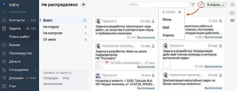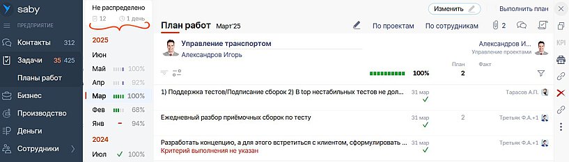 Кликните на счетчик задач — откроется список всех нераспределенных, в том числе без запланированного времени. Счетчик дней Saby покажет только те задачи, по которым плановое время уже есть.