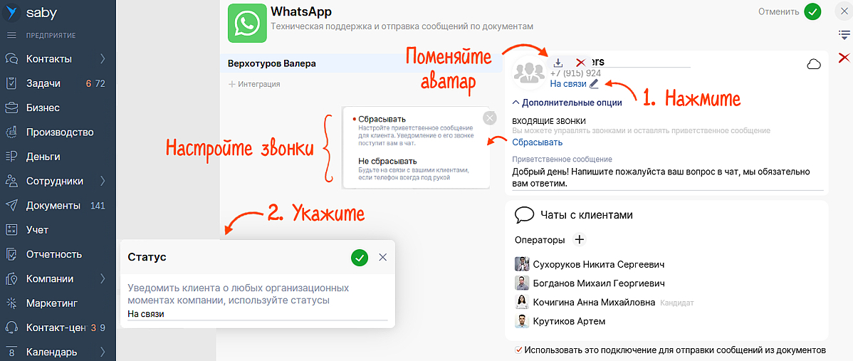 Сообщайте клиентам о важном, например если вы «В отпуске до 10 июня» или появилась «Сидка 20% на все», и загружайте аватар прямо из Saby.