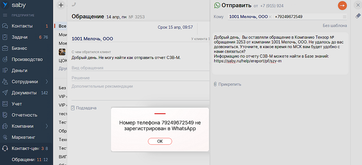 Перед отправкой сообщения или документа Saby узнает, зарегистрирован номер в приложении или нет: нажмите на кнопку «Отправить» — если номер неактивен, система предупредит вас.