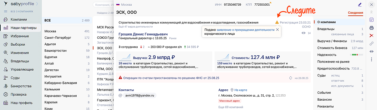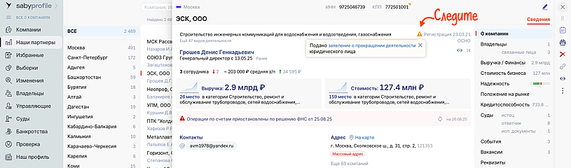 Узнавайте о рисках ликвидации компании заранее. Теперь вы можете видеть, подала ли компания заявление о прекращении деятельности. Получайте об этом мгновенные уведомления в центре сообщений и мобильном приложении. Принимайте решения оперативно: прекращайте отгрузки, возвращайте долги или ищите новых партнеров, минимизируя свои риски.