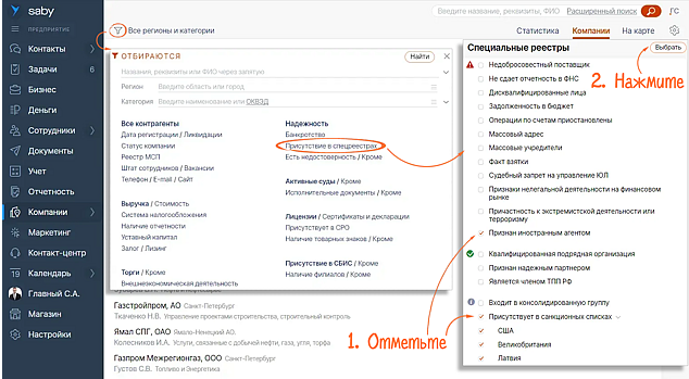 и выберите «Присутствие в спецреестрах». Отметьте флагом пункт «Признан иностранным агентом» или «Присутствует в санкционных списках».