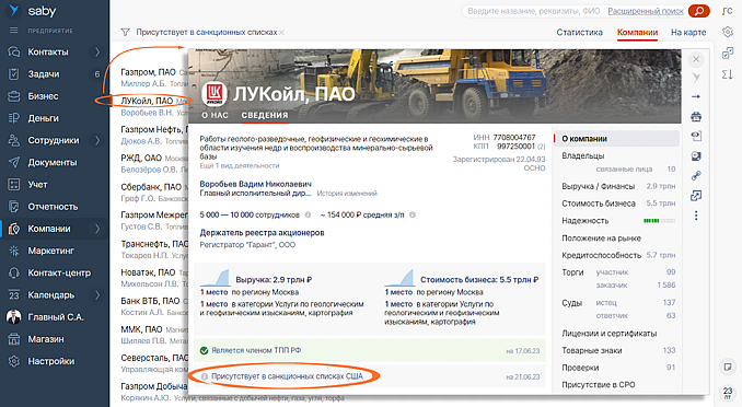 Откройте карточку интересующей компании. Вы увидите соответствующий статус с датой актуальности сведений. По клику на дату или страну, наложившую санкции, откроется источник информации.
