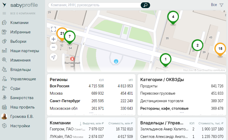 Выборки. В новом блоке вы сможете составить потенциальную базу клиентов с помощью гибкого фильтра по нужным критериям: ОКВЭД или категориям, дате их регистрации, объему бизнеса и другим.